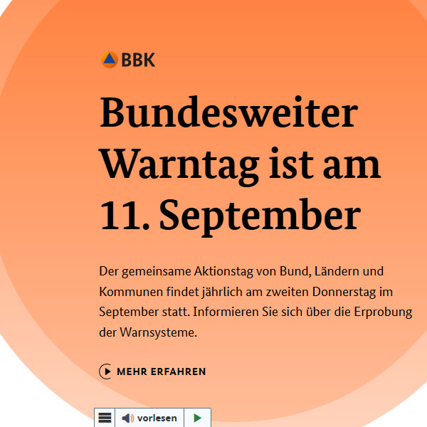 Der 11.09.2025 soll nicht nur zum Testen der Warnsysteme genutzt werden, sondern auch generell zur Information einladen. Viele nützliche Tipps und Ihren persönlichen Notfall-Ratgeber finden Sie auf den Seiten des Bundesamtes für Bevölkerungsschutz und Katastrophenhilfe: Startseite - BBK (bund.de)