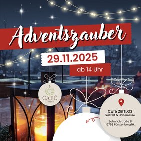 "Wenn sich das Jahr dem Ende neigt, wird es in Fürstenberg/Havel besonders besinnlich: Am Samstag, den 29. November 2025, von 14 bis 19 Uhr laden SENIO-VITAL und das Café ZEITLOS wieder zu einem stimmungsvollen Adventszauber ein. Alle Fürstenbergerinnen, Fürstenberger und Gäste von Klein bis Groß sind herzlich willkommen, die weihnachtliche Zeit gemeinsam einzuläuten.